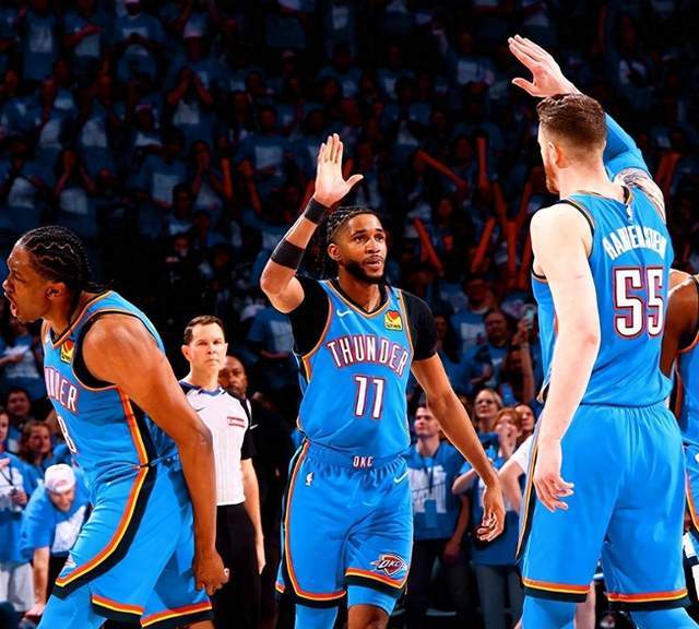 俄城球迷已经有答案了。比赛第三节,Paycom中心全场玩起了人浪。季后赛主场玩人浪,这在NBA并不常见。观众不是在消磨时间,而是在提前庆祝。当一支球队的核心MVP以15投11中的超高效率轻松收割比赛,当角色球员个个能投能防,当连续三年西部第一的统治力摆在账上——这已经超出了“强队”的范畴,这已经是“王朝级”的标配。